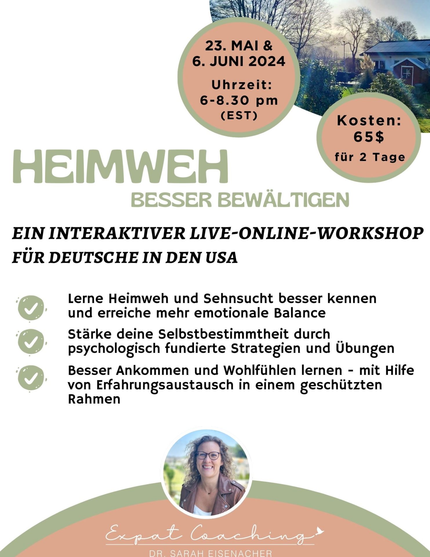 Bist du neugierig wie du mit mehr Zufriedenheit, emotionalem Gleichgewicht und Verbundenheit dein Leben in den USA leben kannst? Lerne, wie du effektiv mit Heimweh umgehen kannst. Sichere dir jetzt deinen Platz für den Workshop in zwei Teilen am 23. Mai und 6. Juni 2024.